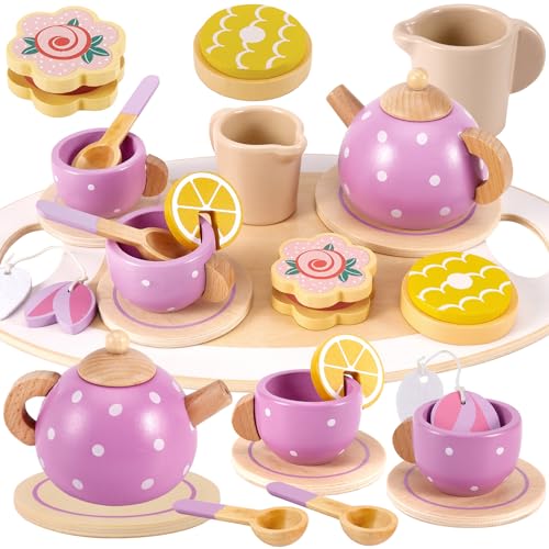it is a very beautiful and perfect set for children. Its two colors pink and pastel green attract to children. It is made of wood. It includes two cups with lid, sugar pot and a mug, a teapot, two spoons, two tea bags and two sugar cubes as well as a plate and two biscuit complete this set. Every baby wishes that his/her .