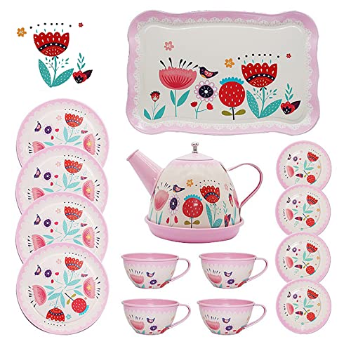 This fun set is perfect for children who like to throw tea parties and teddy bear picnic. This set consists of 14 piece with extra 4 pieces for 4 little guest. This play set  complete with 4 cups, 4 saucer, 4 plates, a teapot and a serving tray. It is very useful and strong as there is a use of stainless steel in it. Cardboard also use in it.